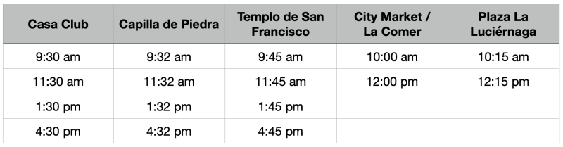 - Puntos de subida/bajada: Casa Club, La Capillita, Centro (Mesones & Relox), Soriana, City Market y La Comer (estacionamiento).